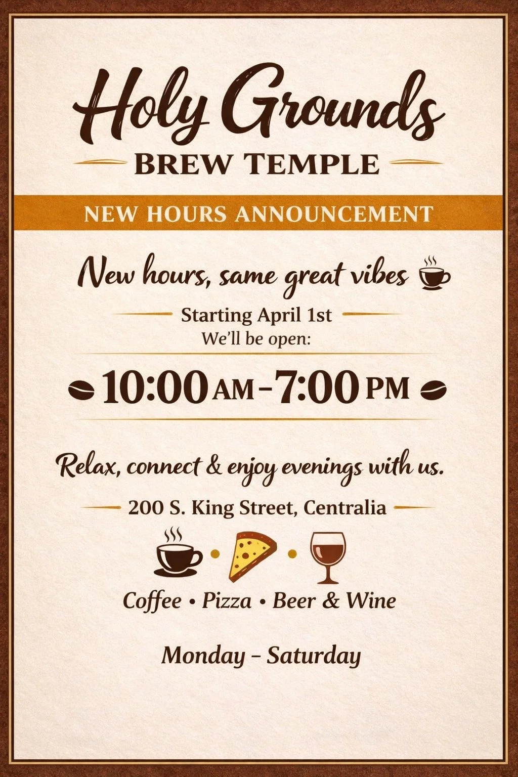 Set inside a beautifully restored historic building, Holy Grounds Brew Temple was built on one simple idea: create a place where people feel welcome. Every drink, every meal, and every conversation adds to that story.